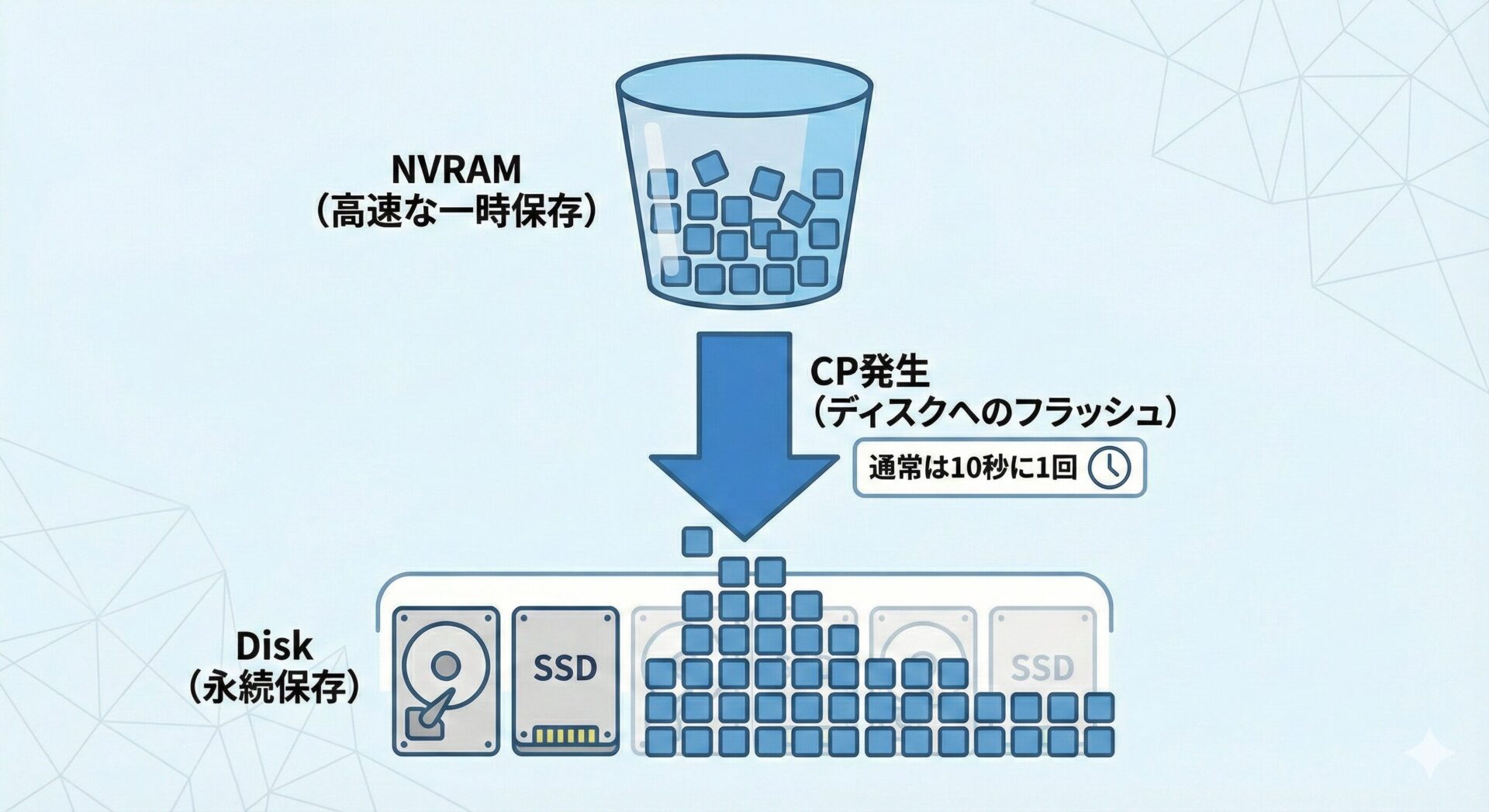 NetApp は高速化のために、サーバーからの書き込みデータを一旦 NVRAM(不揮発性メモリ) という「一時保管場所」に受け取り、そこで「書き込み完了」の返事を返します。 その後、NVRAM に溜まったデータを、まとめて裏で ディスク(HDD/SSD) に書き込みます。この 「NVRAM からディスクへデータをフラッシュする処理」 を CP(Consistency Point)と呼びます。
