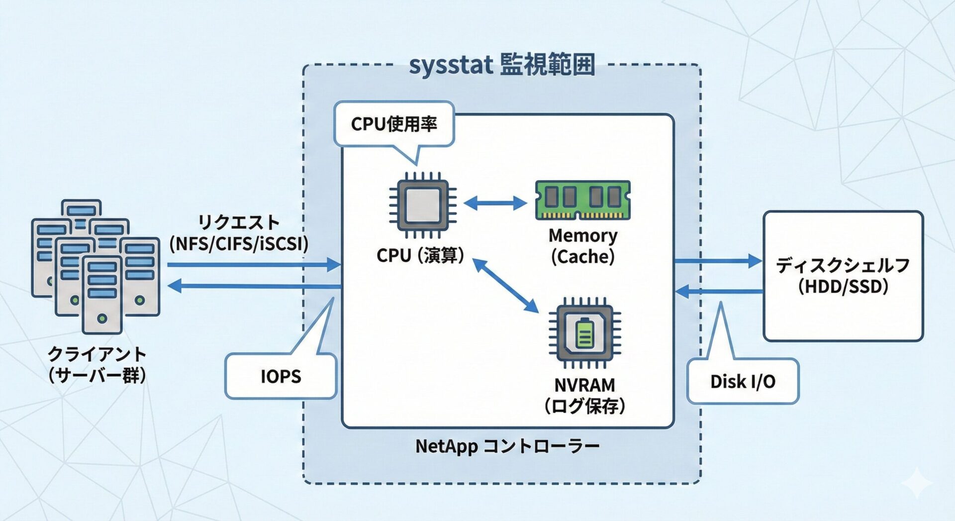 sysstat は、NetApp の OS である Data ONTAP に標準実装されている、最も基本的かつ強力な性能統計ツールです。 外部ツールをインストールする必要なく、SSH やコンソールからコマンドを叩くだけで、ストレージコントローラー全体の稼働状況 をリアルタイムに表示します。