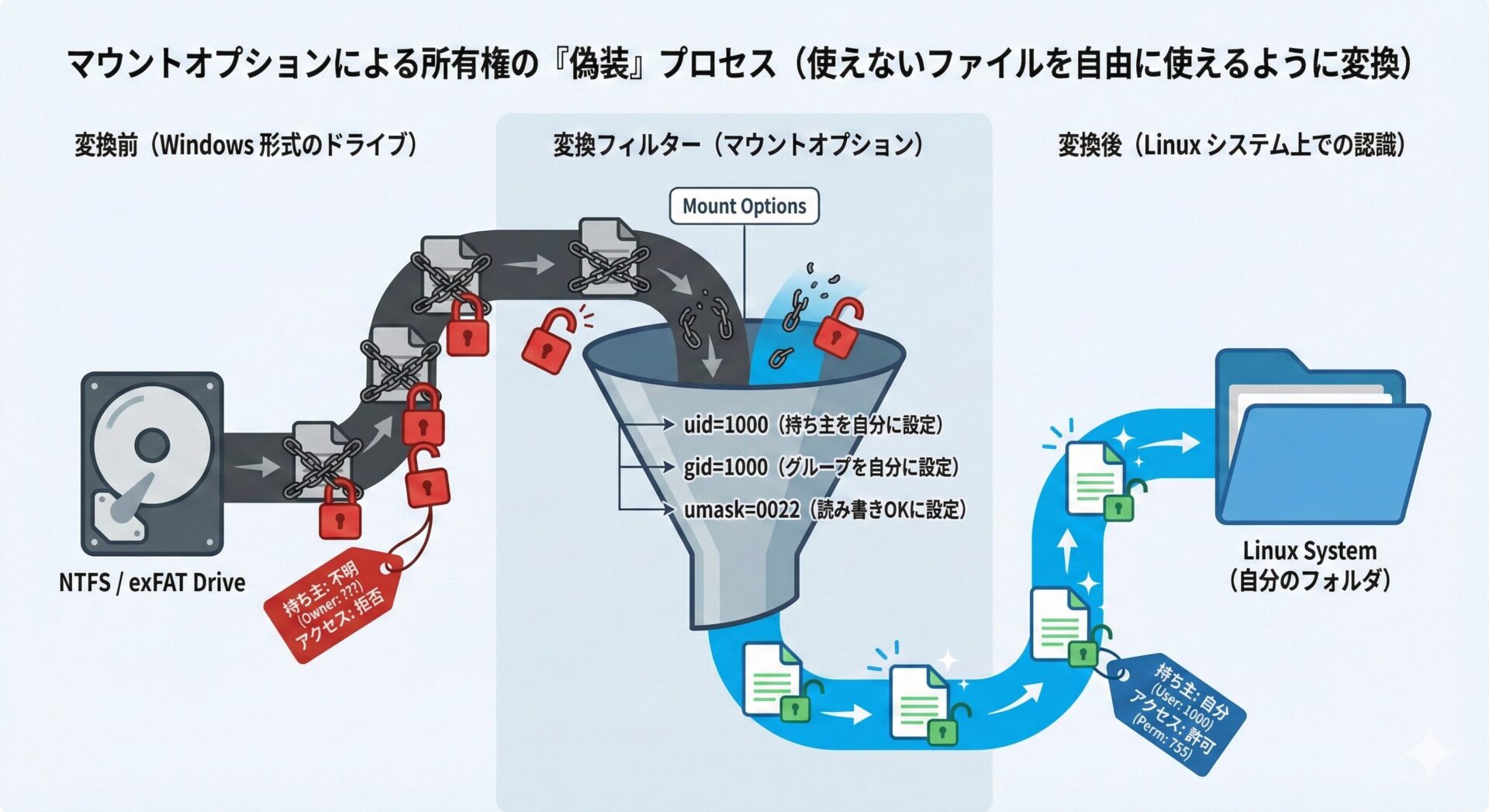 通常、Linux のファイルシステムでは「ファイル A はユーザー A のもの」「ファイル B はユーザー B のもの」と個別に管理します。 しかし、NTFS/exFAT をマウントする場合は、「このドライブの中にあるファイルは、全部ユーザー A のものってことにする!」 と一括で決め打ちします。