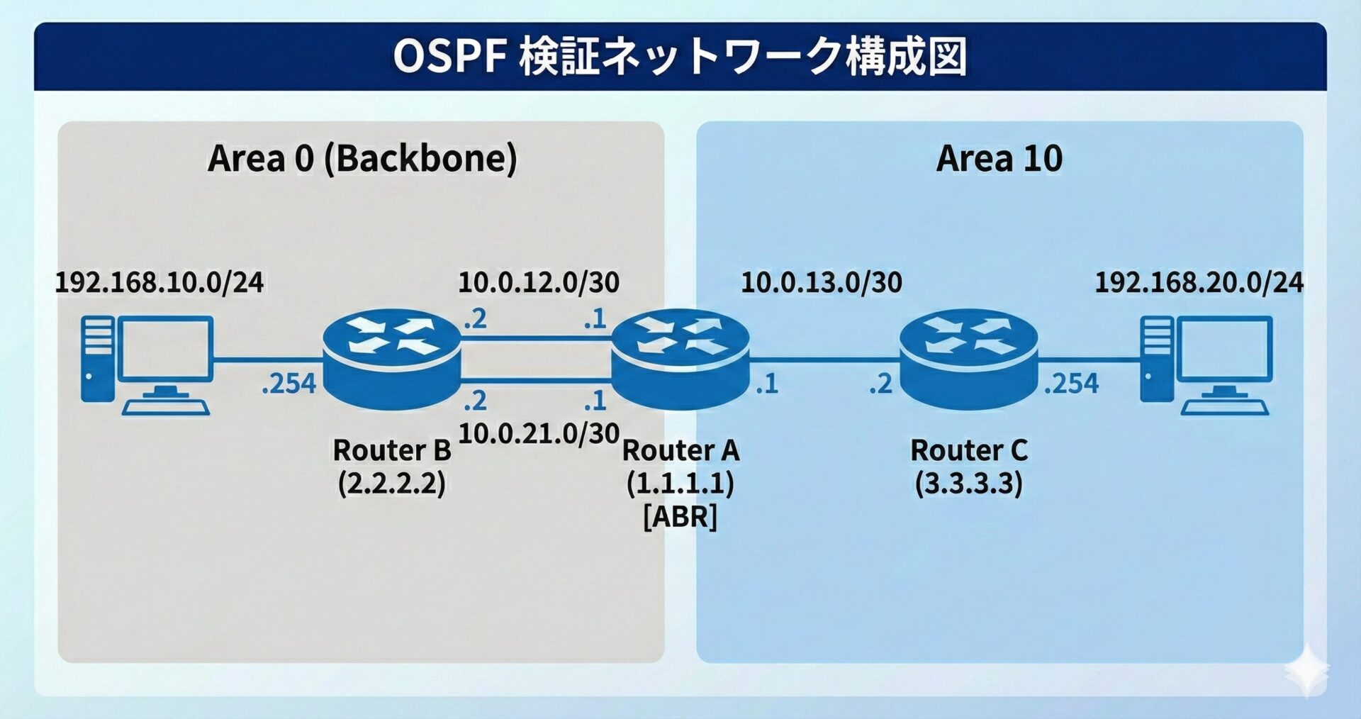 - 基本設定: シングルエリア(Area 0)とマルチエリア(ABR)の構築手順