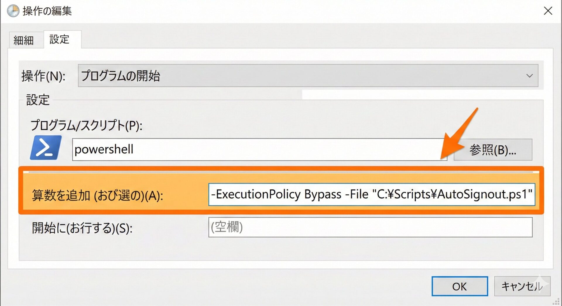 プログラムの開始設定(powershell.exe の指定と引数の書き方)