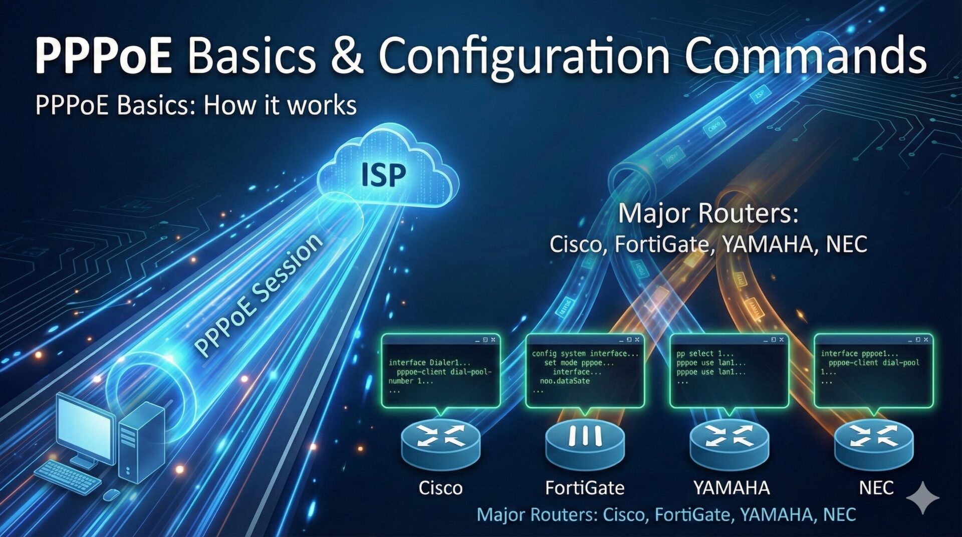 本記事では、PPPoE の仕組みの基礎から、日本の現場でシェアの大部分を占める 主要メーカー(Cisco, FortiGate, YAMAHA, NEC) の設定コマンドを解説します。