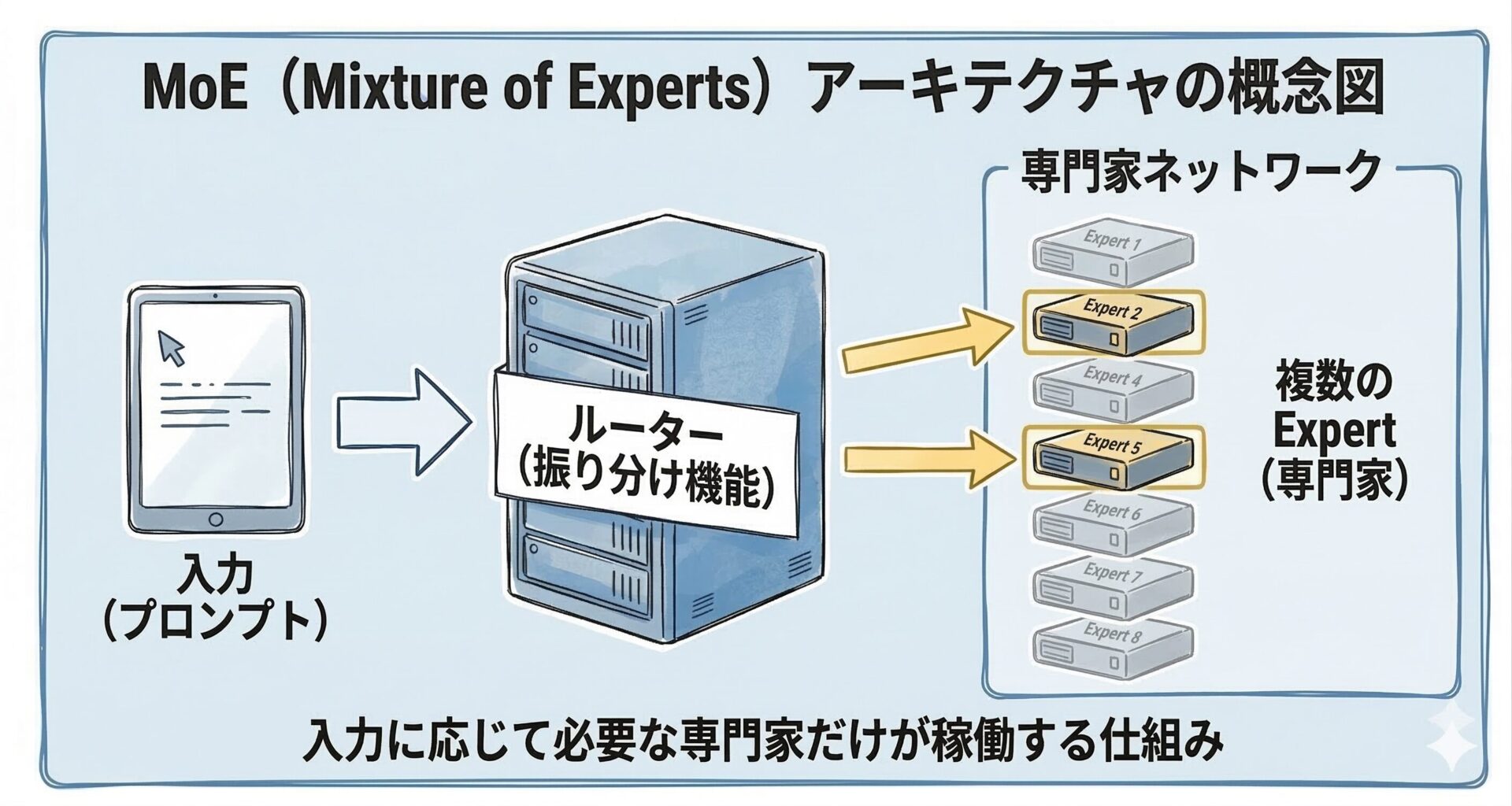 MoE は、モデル内部に複数の「専門家(Expert)」ネットワークを配置し、入力された文章(タスク)の性質に応じて、必要な専門家ネットワークのみを部分的に稼働させる仕組みです。これにより、計算リソースの消費を抑えながら、高度な推論能力と高速な処理を両立しています。