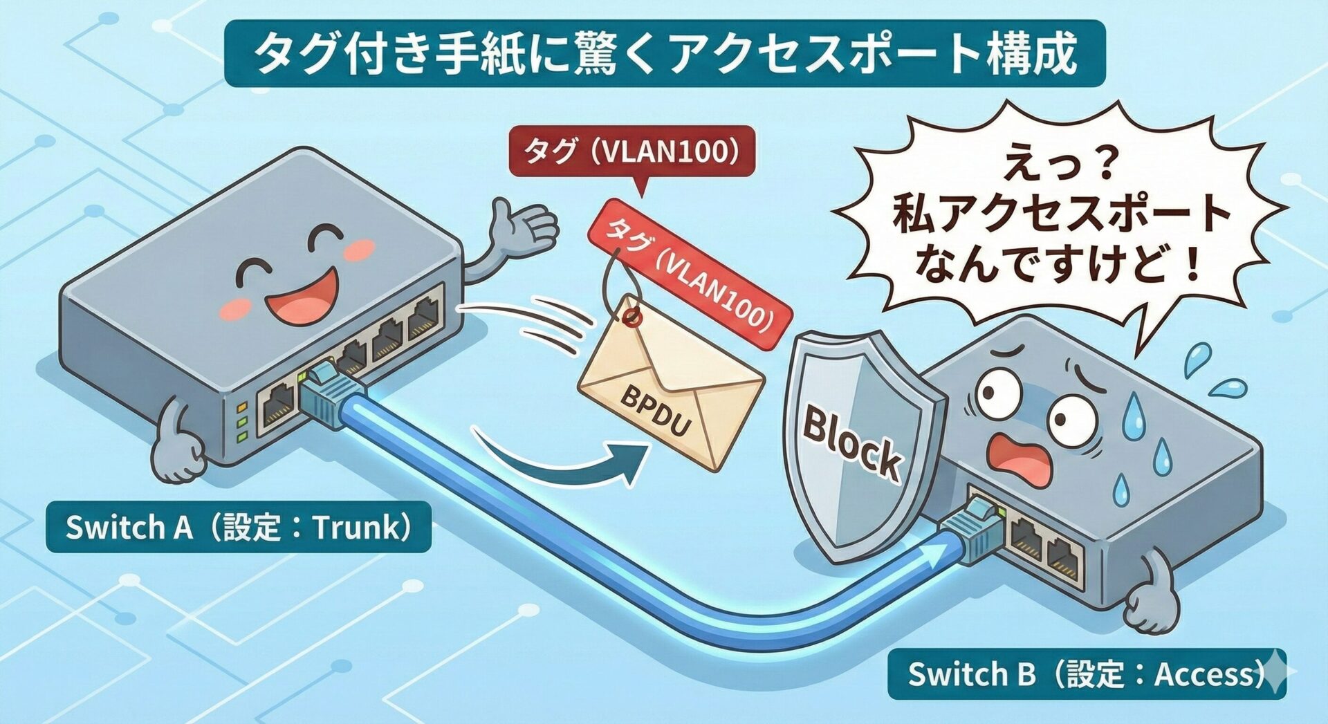 つまり、スイッチは「自分はアクセスポートとして待機していたのに、相手からトランクポート用の挨拶(タグ付きBPDU)が来た! 話が違うぞ!」と言っているのです。