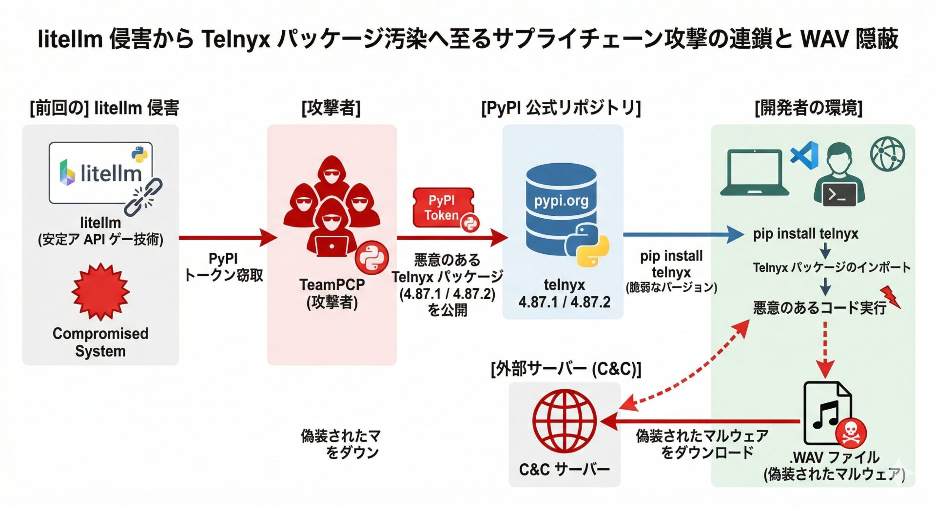 今回、脅威アクターである TeamPCP は、新たに Python の Telnyx パッケージを侵害し、悪意のあるバージョンを PyPI リポジトリへ公開しました。この攻撃は、以前の litellm 侵害で窃取された認証情報が悪用された三次被害である可能性が高く、さらに音声ファイル(.WAV)を用いた高度な隠蔽工作(ステガノグラフィ)が採用されています。