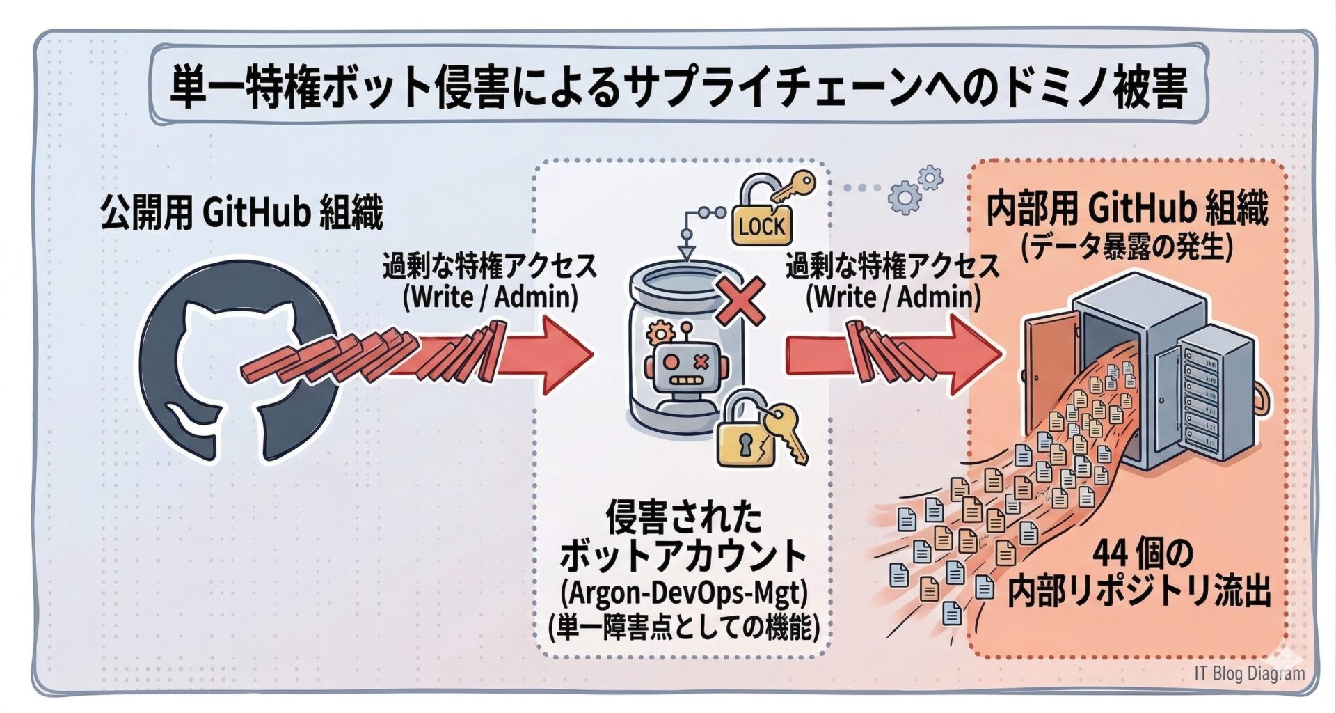 長期間有効な Personal Access Token(PAT)を持ったボットアカウントが、公開用と内部用の両方の組織に対して過剰な権限(書き込み・管理者アクセス)を持っていたことが、被害を劇的に拡大させる「最弱の環」となりました。