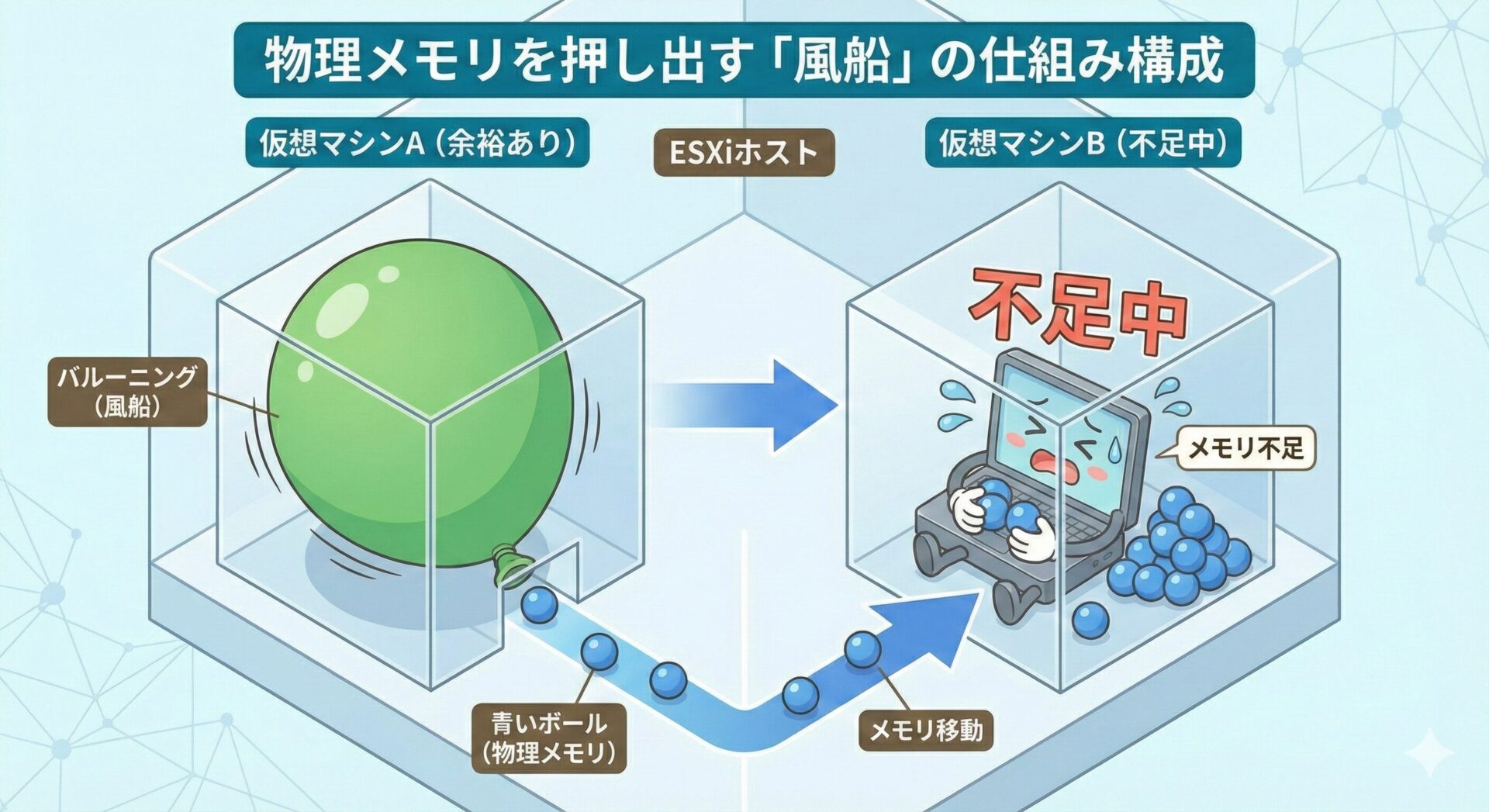 VMware ESXi には、搭載している物理メモリの限界を超えて仮想マシンを動かすための、高度なメモリ管理機能が備わっています。 その中でも、物理メモリが足りなくなった時に発動する「救済措置」の一つが、今回解説する 「メモリバルーニング(Memory Ballooning)」 です。