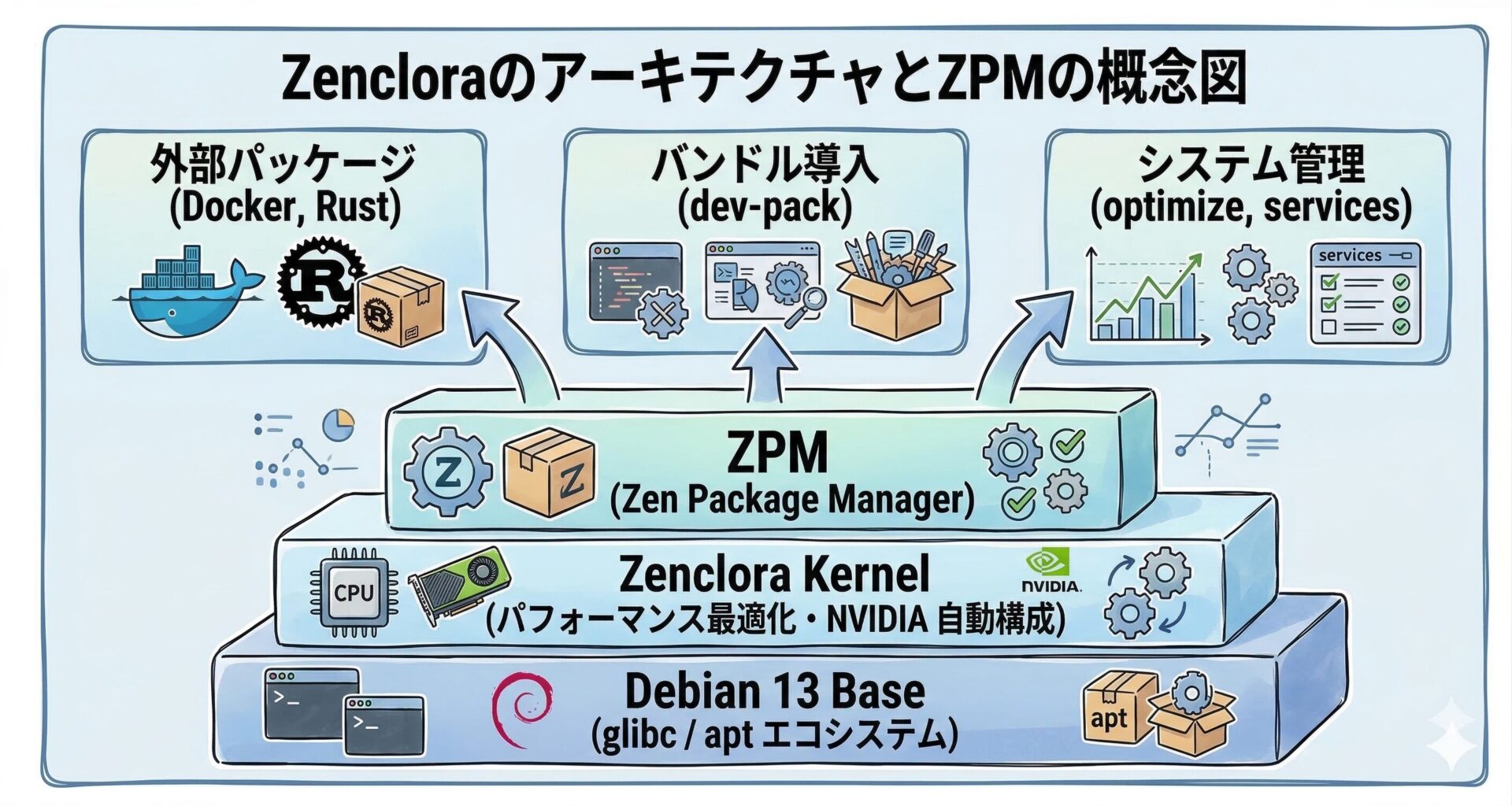 ZPM は単なる apt のラッパーではなく、以下のようなシステム管理と環境構築のハブとして機能します。